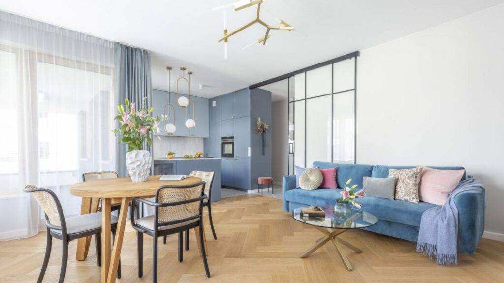 Пространство, в котором преобладают синие цвета, кажется прохладным и воздушным, ведь сам синий цвет ассоциируется с открытым пространством, небом, водой, воздухом и свободой. Мы воспринимаем светлые оттенки синего как символы чистоты, свежести и покоя. Этот цвет настолько универсален, что подходит ко всем комнатам в доме. Синее оформление чаще всего встречается в ванных комнатах, детских или гостиных .