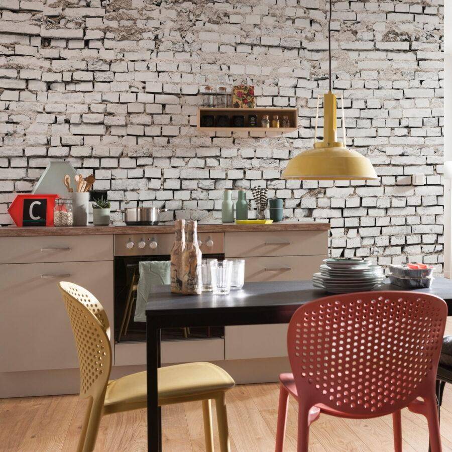 На маленькой кухне великолепно смотрятся одинарные обои «Вид из окна», визуально расширяющие площадь помещения или фартук (стена между шкафчиками и столешницей) с оригинальным изображением, увеличивающий объем кухни.