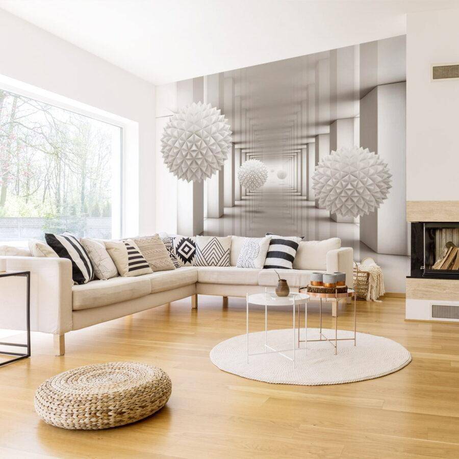 Красивые 3д обои в интерьере гостиной, фото которых проиллюстрировано ниже, смогут менять обстановку, внося в интерьер элементы сюрреализма. Черно-белые спирали и объемные шары и волны превращают привычную обстановку с диваном и столиком в неповторимую иллюзию, завораживающую фантазию.