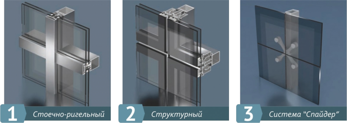3. Структурная система. В витражном остеклении стеклопакет монтируется к каркасу с помощью клеевого состава. Таким образом, внешняя сторона фасада остается полностью стеклянной, поскольку швов не видно.