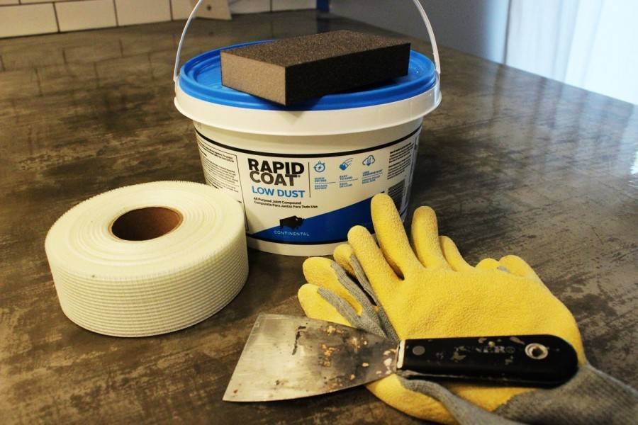После заполнения, пока состав еще не высох, его проклеивают сеткой серпянкой или бумажной армирующей лентой. Это необходимо чтобы на стыках на образовывались трещины. Если используют ленту, ее разрывают на нужные куски, замачивают в чистой воде минут на 10 (пока заполняют шов).