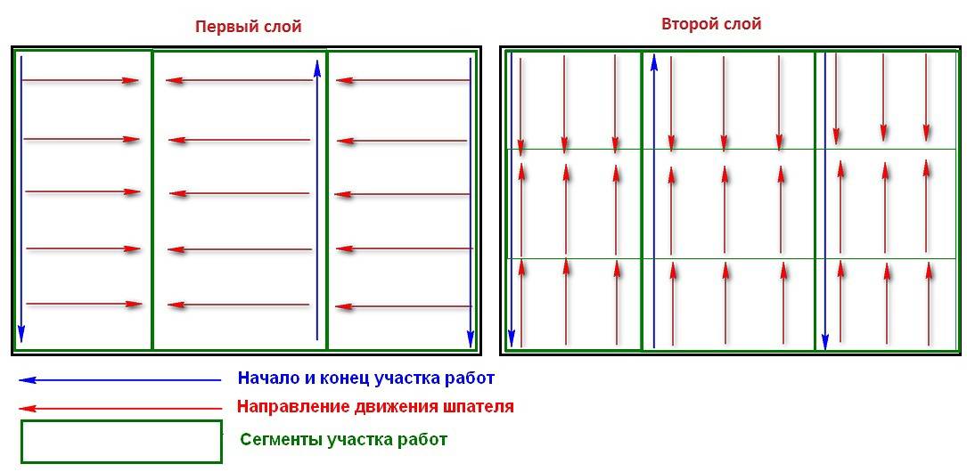 Можно наносить стартовую шпаклевку по направляющим, за один раз толстым слоем. Это удобно при использовании акриловых смесей. Но многослойная технология дает лучшие результаты при изменении температурных режимов.