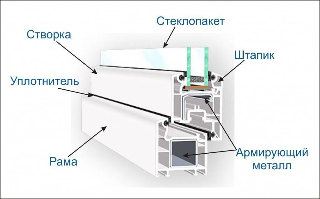 Современная ПВХ конструкция представляет собой довольно сложное техническое решение, состав которого включает в себя несколько элементов. Основные составляющие качественного современного окна наглядно показывает рисунок, расположенный ниже.