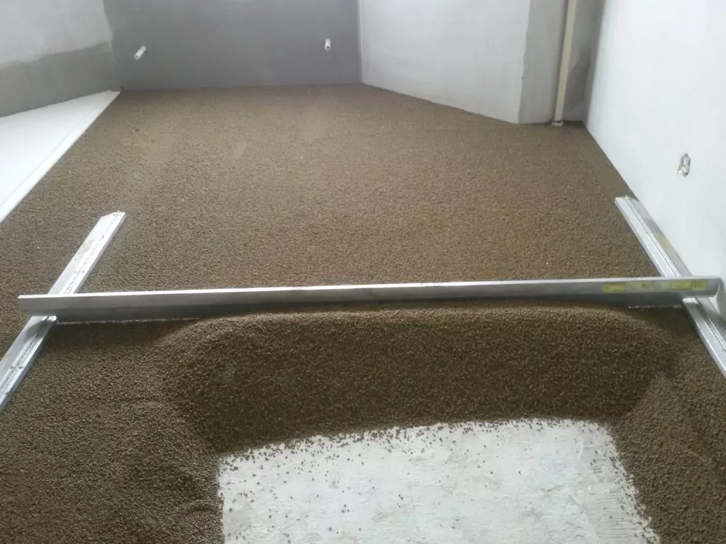 Смесь полусухой стяжки равномерно распределяется по комнате