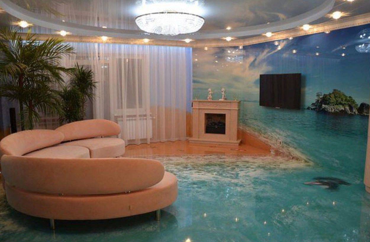 Для создания необычного интерьера часто сочетают с 3D-обоями полы и потолки. Так можно получить сногсшибательный эффект – в вашем помещении не будет границ пространства! Однако стоит заметить, что сделать такое сочетание самостоятельно вряд ли удастся – это уже задача для настоящего профессионала.