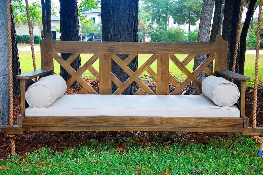 Такие деревянные качели под старину добавит в отдых на природе особую романтику. Они изготавливаются из массива сосны индивидуально для каждого клиента. На гладко-отполированной поверхности нет ни единого сучка. Кроме того, конструкция имеет скрытые крепежи. А мягкий матрас с двумя подголовниками сделает пребывание на природе еще приятнее.