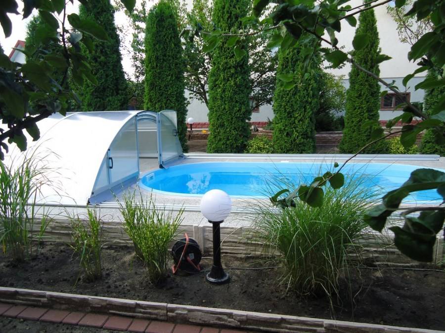 Каждый владелец дачного дома сам решает, нужно ли ему устанавливать для бассейна тент или навес, но, если выдалось жаркое лето, дополнительное притемнение воды поможет дольше сохранить её качества. Для компактных моделей можно установить конструкцию из поликарбоната, для купелей большой площади отличный вариант – раздвижная система, которая поможет отрегулировать температуру внутри купальни.