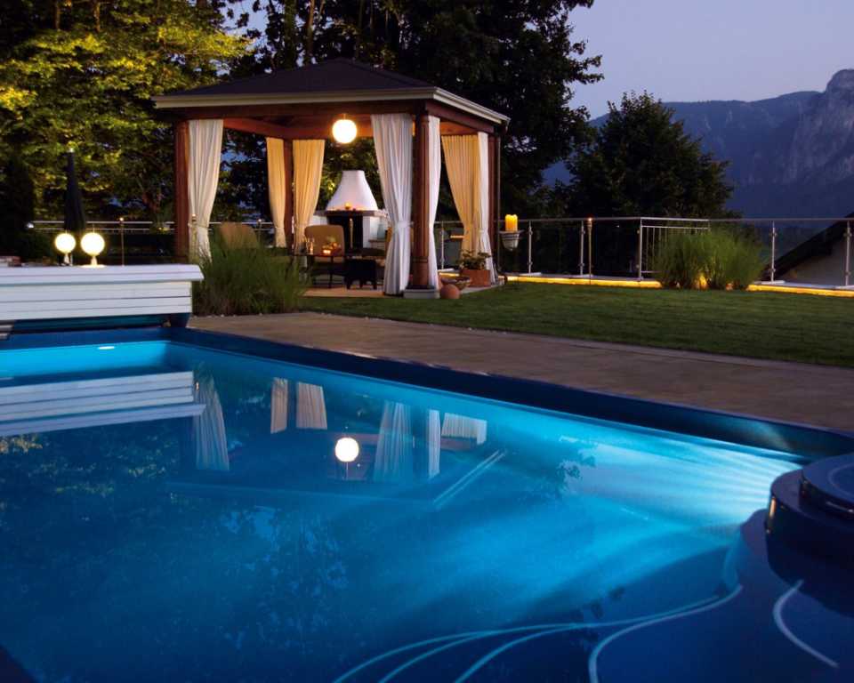 Вкупе дизайн получается богемным и шикарным на вид.Немаловажной является и подсветка ландшафтного бассейна. Она может быть разной — от маленькой гирлянды над столовой группой до полноценного дизайнерского освещения по всему периметру участка