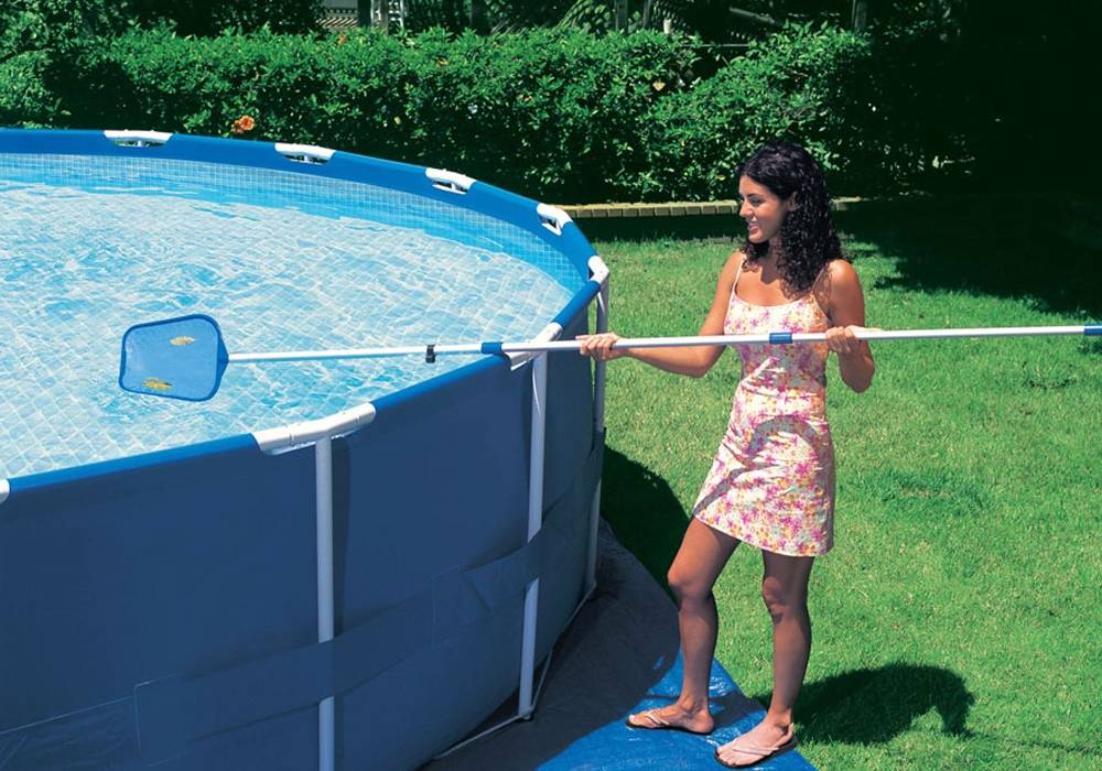 Физический метод чистки подразумевает удаление сачком или водным пылесосом с водного зеркала твёрдого мусора, например, такого как ветки, листья и насекомые. Так как данный тип бассейна открыт и на него нельзя установить мощные очистительные системы, вам придётся чистить его таким способом ежедневно. Если же вы хотите автоматизировать читку водоема от более мелких частиц, то вы вполне сможете это сделать при помощи установки специального фильтра, поставляемого обычно в комплекте с разборным бассейном. Обычно такой фильтр задерживает внутри себя грязь, что частично решает проблему чистоты воды.