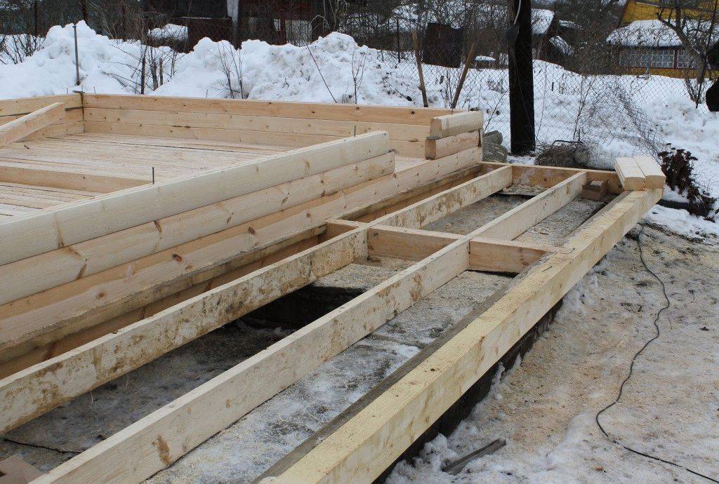 По уровню выравниваем верхнюю кромку фундамента, прокладываем 2 ряда рубероида для гидроизоляции. Укладываем антисептированные и обработанные битумной мастикой доски пятидесятки большего формата: на них обопрутся лаги.