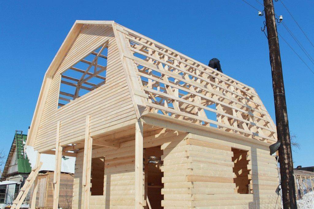 Черновая крыша состоит из потолочных балок, обрешетки и стропил, которые монтируются согласно проекту. После того, как будут возведены стены, происходит кладка лаг. При этом концы лаг должны выступать на полметра от стены.