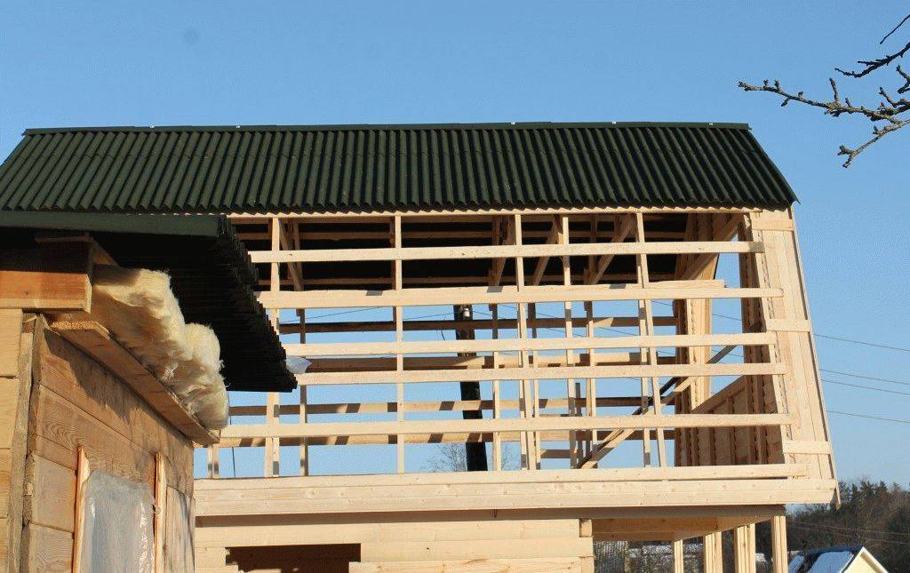 Для лаг идеально подойдет брус сечения 15х10 сантиметров. Лаги устанавливаются на ребро, на расстоянии 90 сантиметров друг от друга. На следующем этапе происходит монтаж стропильной системы для чего используются доски 5х15 сантиметров.