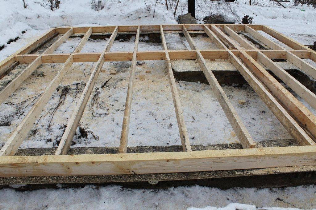 После окончания процесса монтажа нижней обвязки происходит укладка лаг для пола. Лаги укладываются на ребро, после чего зашиваются черновым полом, который выполняется из досок 2,5х15 сантиметров. Чистовое напольное покрытие зачастую выполняется из шпунтовой доски.