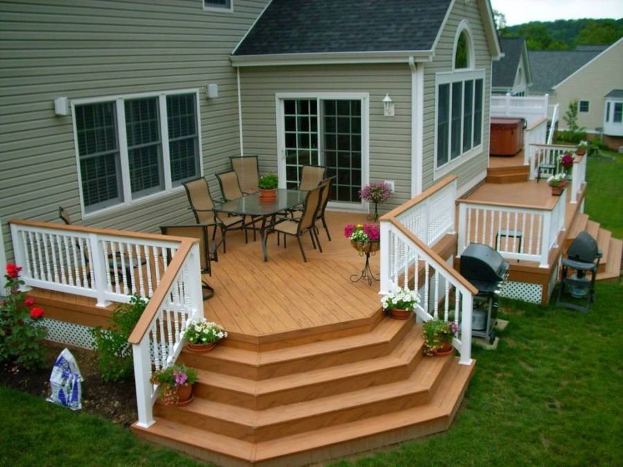 - расположению. Площадка может примыкать к дому или другой постройке (например, бассейну), окружать сооружение со всех сторон или частично, располагаться отдельно от всех строений усадьбы.