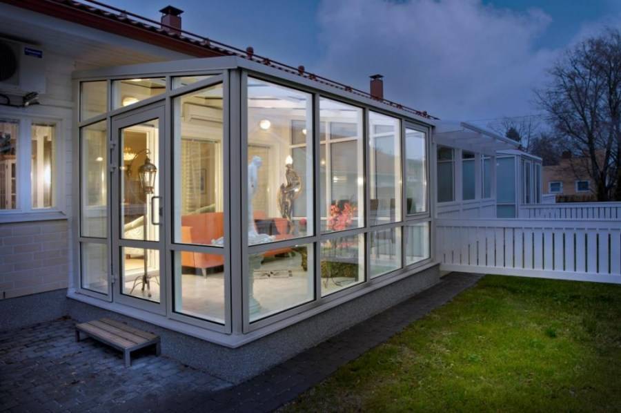Окна панорамного остекления, стеклянные двери и раздвижные системы дают возможность отойти от использования традиционных материалов при обустройстве пристройки. Закаленное стекло и триплекс — это отличный материал с высокой прочностью к ударам и механическим воздействиям, а металлические профили входных дверей и панорамных окон бывают как «холодными», так и «теплыми».