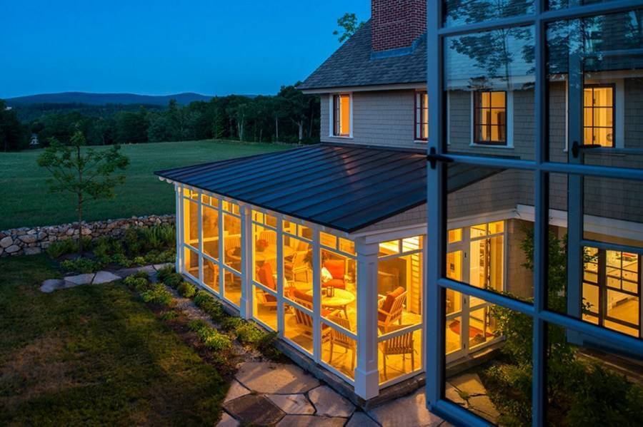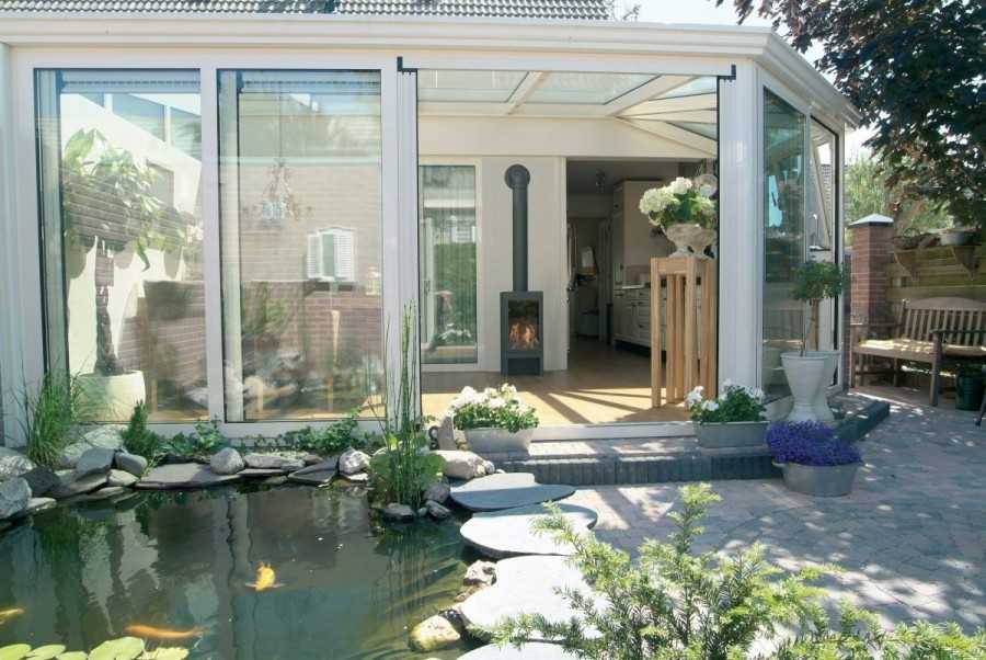 Современный вариант веранды – из готовых стеклопакетов. Конструкция выглядит легкой и невесомой, а использование передовых технологий, а именно раздвижные системы окон, позволяют трансформировать закрытую веранду в открытую летнюю террасу.