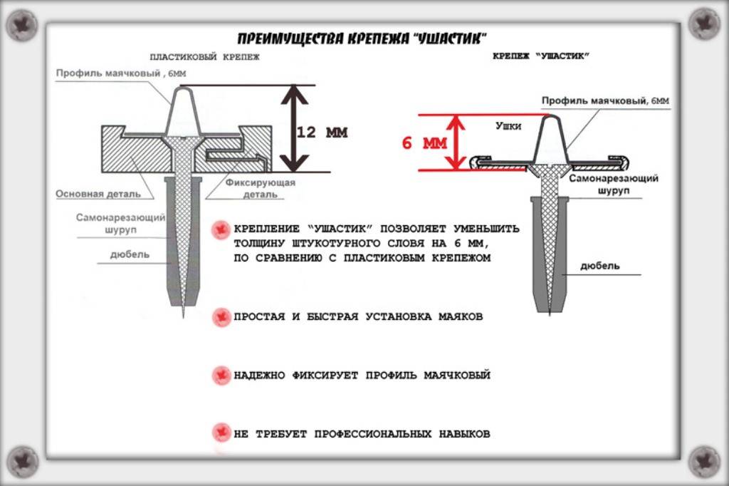 Поэтому разновидность маячков из пластика применяется только для внутренней отделки. Элементы не используются для фасадного оштукатуривания также из-за небольшой устойчивости к механическим повреждениям. Пластиковый маяк требуется установить при оштукатуривании правильно, чтобы предотвратить последующее растрескивание декоративного покрытия.