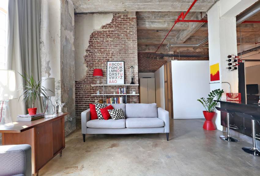 - Поп-арт. Забеленный кирпич в сочетании с яркой мебелью и картинами подчёркивает вызов и эмоциональный посыл интерьера.