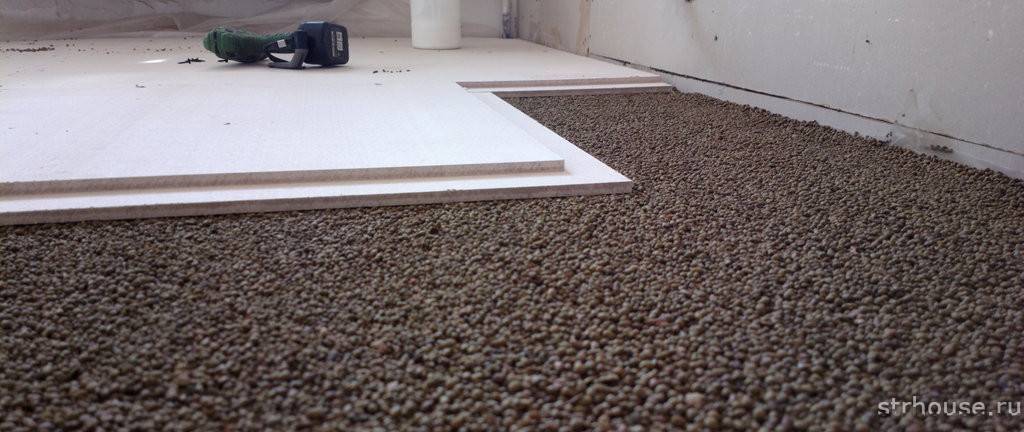Если делается не сухая стяжка песком, а гранулами керамзита, то они должны иметь по возможности меньшие размеры. Ведь на них будут опираться листы выравнивающего материала, который в случае крупных гранул будет иметь точечную, хаотично расположенную опору и от этого будет деформироваться, появятся провалы.
