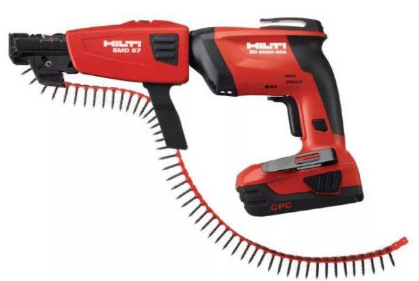 Специфика эксплуатации этого оборудования: устройство заряжается на весь монтаж гипсокартона. Вкручивание метиза происходит за несколько секунд с момента касания самореза к ГКЛ (читайте о саморезах для гипсокартона на нашем сайте). Затем под битой включается специальный механизм, и из ленты подается саморез. Цикл завершается после опустошения кассеты.