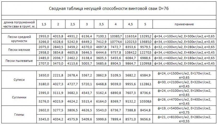 Для определения примерной несущей способности свай конкретного типа нужно посмотреть в таблицу с соответствующими показателями. Более точная информация, используемая в финальных вычислениях, указывается производителем в спецификации на конкретный товар. Стоит учитывать, что минимальное расстояние, на котором вкручивают сваи для дома и террасы – 108 см.