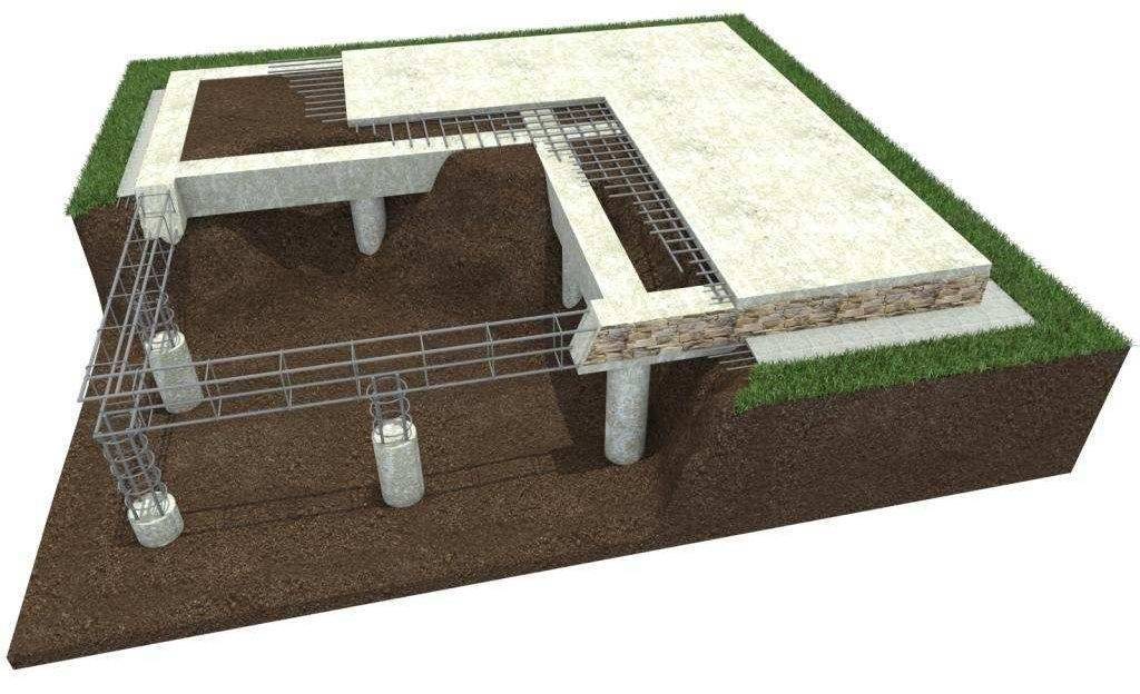 Этот тип основания предполагает использование двух технологий — свайного и плитного фундамента. Подготовительный этап одинаков для всех видов — очистка территории, разметка и планировка конструкции. Требуется уплотнение почвы для установки свай. Решаются вопросы подготовки территории к прокладке коммуникаций, создается дренажная система.