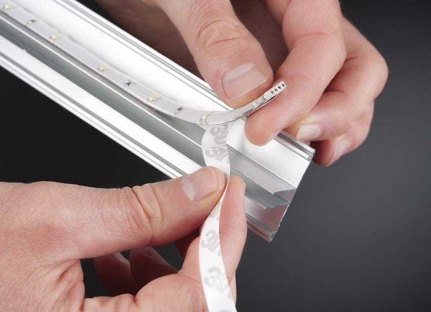 Вначале выбирают место будущего расположения ленты, учитывая потребность в освещении и дизайн помещения. Универсальный метод крепления диодных лент — при помощи алюминиевых профилей с защитными светорассеивающими пленками. Порядок монтажа будет таким: