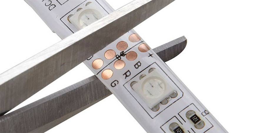 - Провести замеры, чтобы точно определить длину кусков светодиодной ленты. Резать ее можно только в определенных местах, поэтому длину элементов нужно подбирать с учетом этого момента. Резать по линии, где есть контакты для подключения.