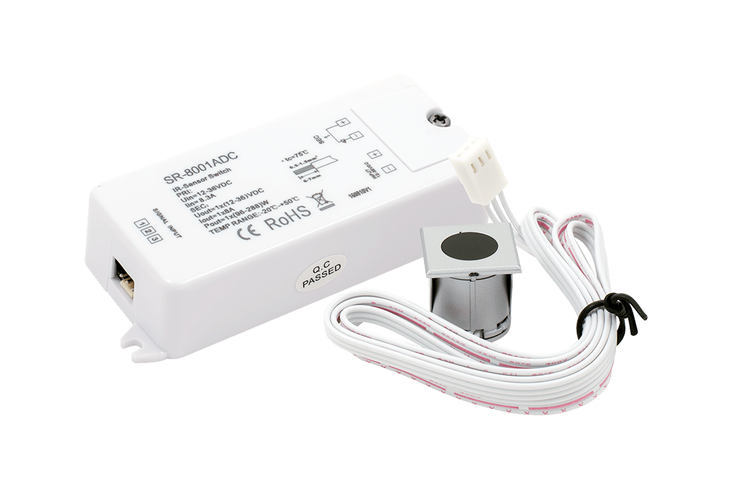 Такое освещение можно дополнить умным выключателем – датчиком движения. Его подключение придаст удобства в повседневной эксплуатации. Вам не придется нажимать клавишу, чтобы включить или выключить свет. Монтируется он в удобном месте, как правило, в верхнем шкафу или в стене около мойки. Выключатель также имеет небольшой блок управления, который располагается рядом с блоком питания.