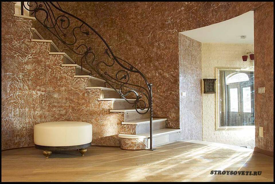 - Декоративная. Наносится шкурками, распределяется достаточно легко. Слой обычно составляет до 5 мм. Используется в случаях, когда выравнивать стены нет необходимости.