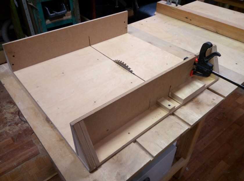Можно сделать простую конструкцию или оснастить ее расклинивающим ножом съемной конструкции. Дополнительно выполняют дисковую защиту, чтобы рабочая стружка не летела на человека, который будет работать за столом. Чтобы делать распил под углом, необходимо добавить детали для регулирования наклона диска.