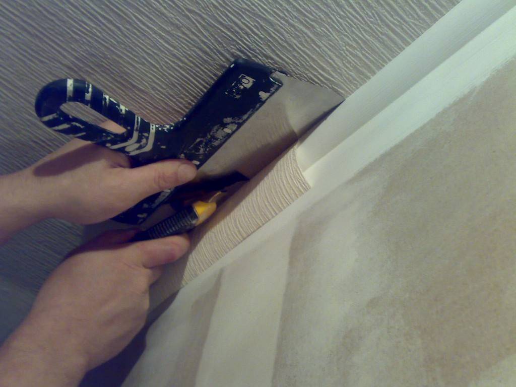 - После того как лента улеглась без складок, нужно взять металлический шпатель длинной не менее 30 см и плотно прижав его к той стене на которой наклеена основная часть ленты, упереть в угол. Обойный нож при подрезке держится как можно ближе к плоскости шпателя.