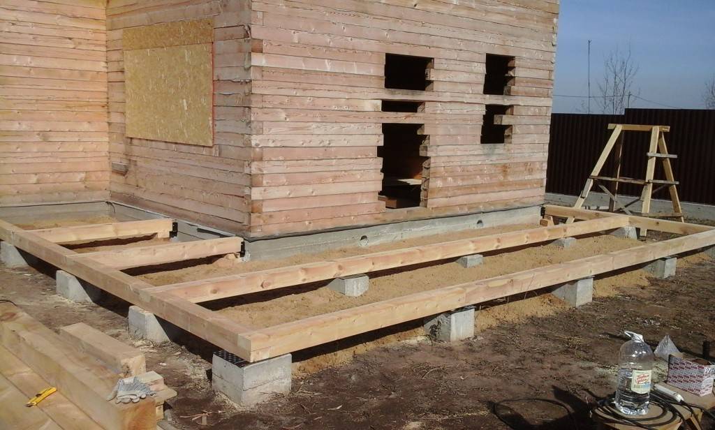 Брус укладывается на столбчатый фундамент через гидроизоляционный материал и крепится к дому при помощи металлических уголков. Для продления срока службы дерева его необходимо обработать специальными пропитками. Так как веранда находится не внутри помещения, а снаружи, то можно воспользоваться старым дедовским способом, и обработать обвязку и половые лаги отработанным машинным маслом.