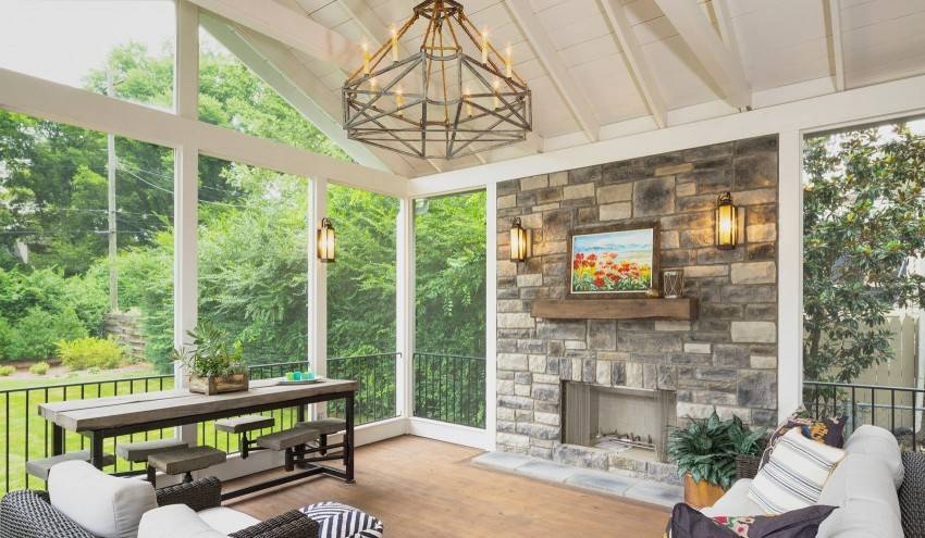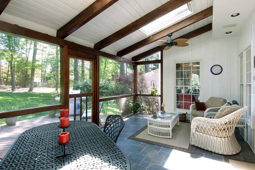 Для дачного дома, который используется только в летний период и в хорошую погоду, целесообразно построить террасу. Если помещение планируется использовать круглогодично, значит есть смысл ставить панорамные окна, двери, чтобы в непогоду можно было спокойно пить чай или отдыхать, не переживая, что осадки попадут внутрь.