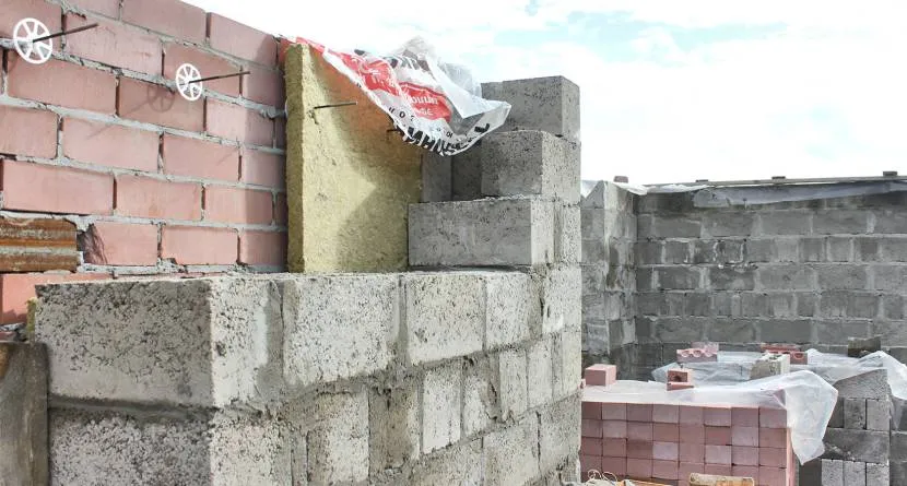 - Если кладка двухрядная, ряды наружной и внутренней стен поднимают одновременно. Чтобы повысить термоизоляцию, рекомендуется укладывать между рядами утеплитель, например, пенополистирол толщиной порядка 4 см.