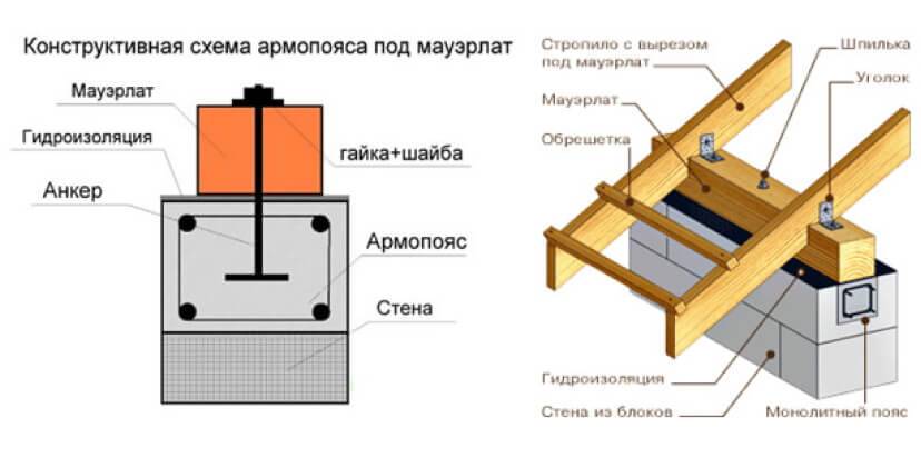 Мауэрлат-это фундамент крыши, которой принимает нагрузку от крыши. Основная цель мауэрлата равномерная распределение нагрузки от крыши к стенам монолитное устройство армопояса требует соблюдения правил мауэрлата. Во время монтажа каркаса арматуры в У — блок из него выводят вертикальные отрезки арматуры на расчётную высоту. Закладная арматура для крепления маурлата представляет собой металлический стержень на одном из концов резьба примерно 40мм.