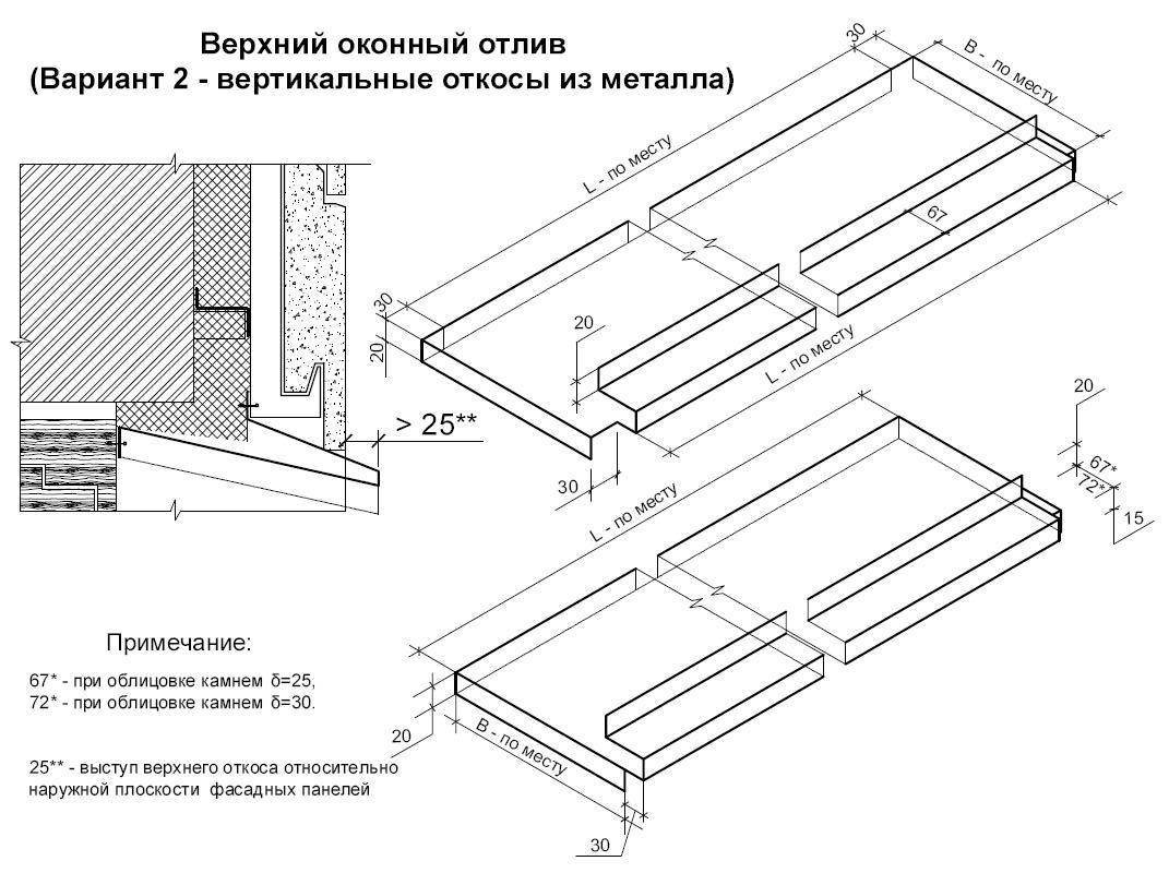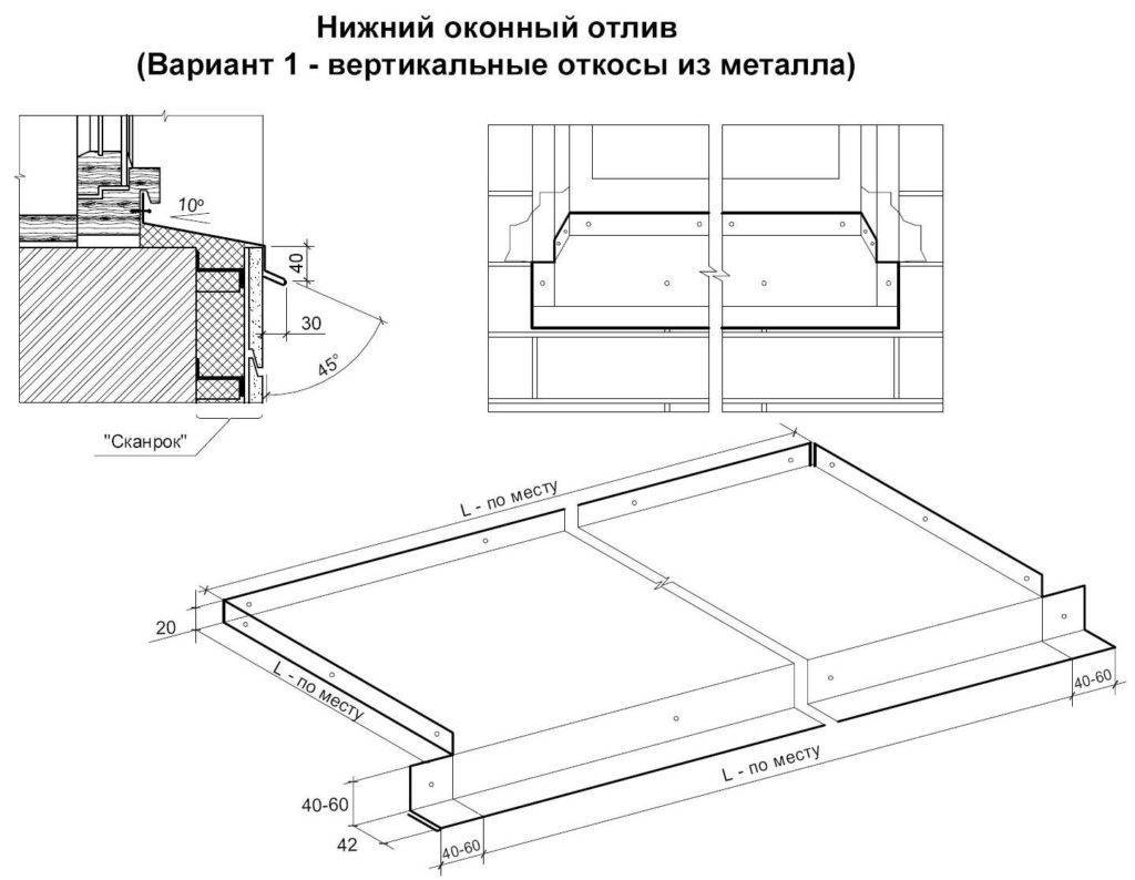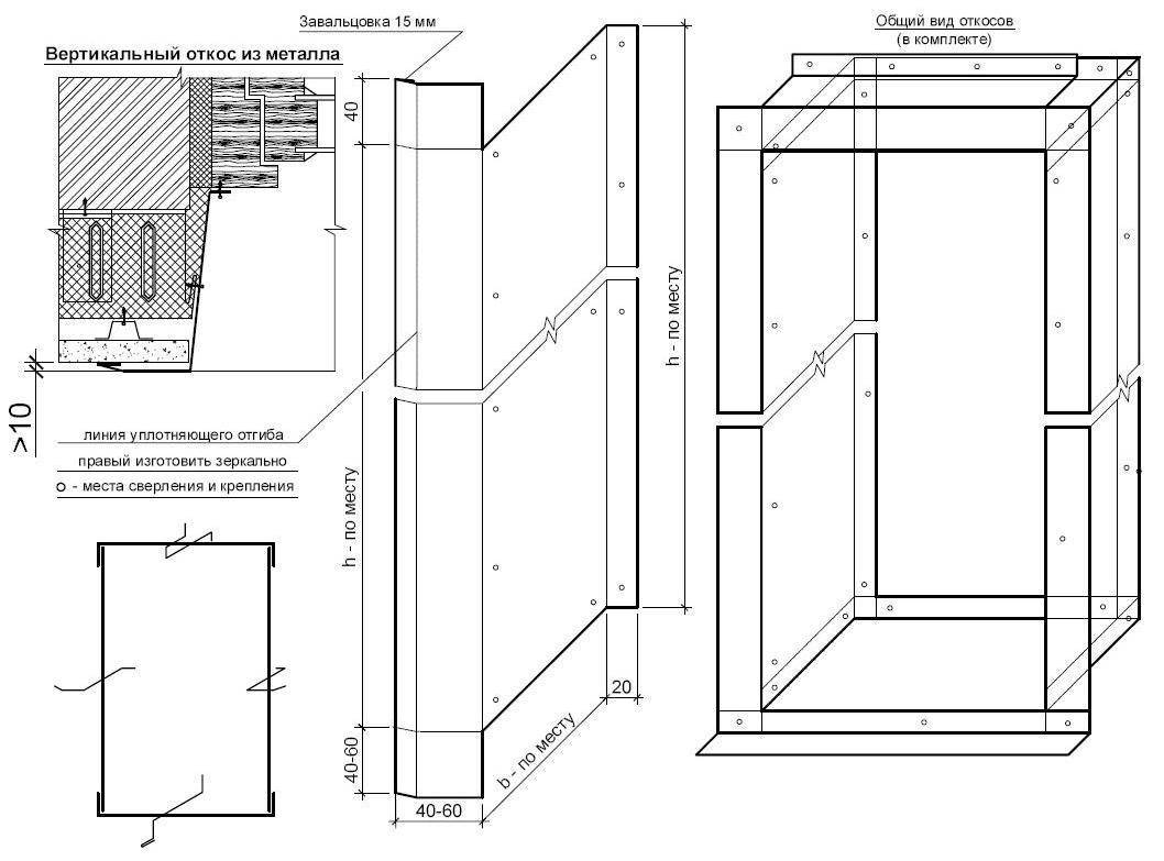 Установка металлических откосов на окна предполагает проведение замерочных работ. Ширина и высота изделия будут соответствовать внутренним и внешним параметрам проема. Изготовление верхнего, нижнего и боковых металлических элементов производится путем вырезания их из заготовленного металлического листа в соответствии с полученными измерениями.
