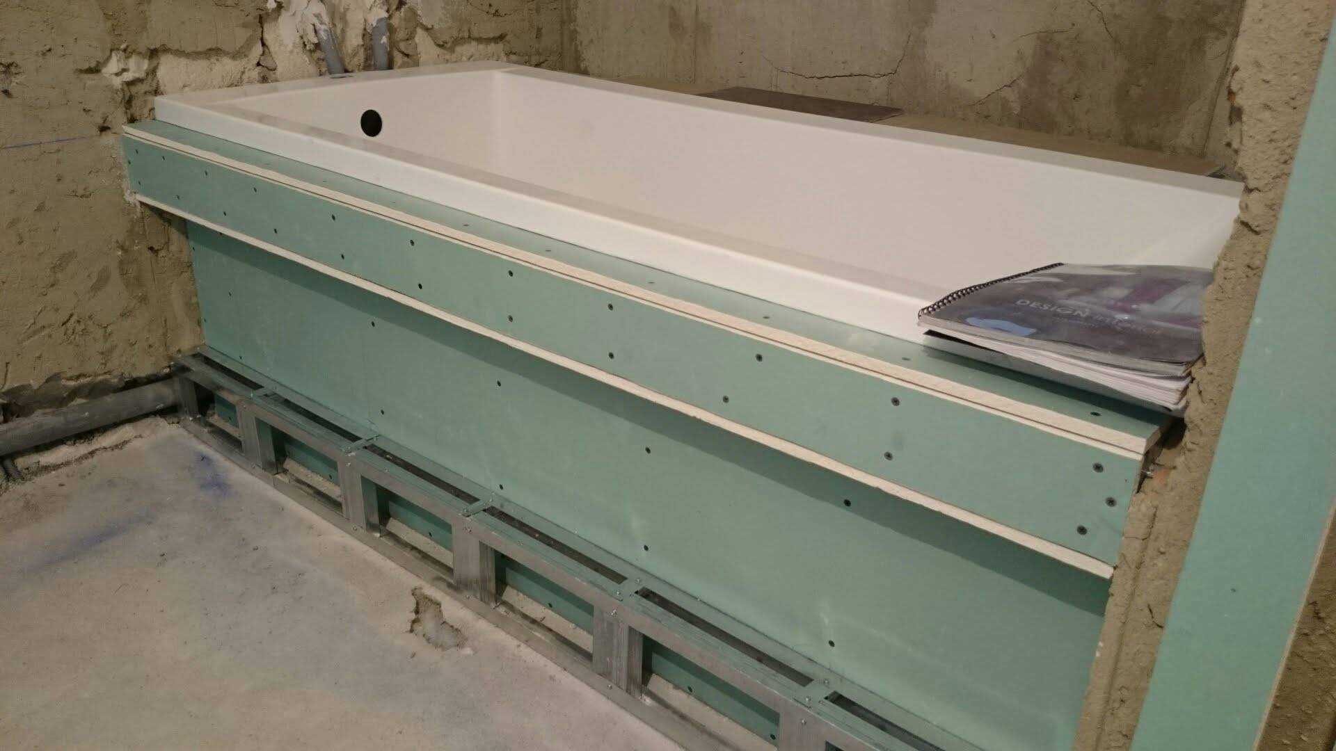 Не стоит забывать, что кафель кладут не только на стены, им можно обложить саму ванну или умывальник. Для этого также сооружается металлокаркас, что потом обшивается гипсократоном.