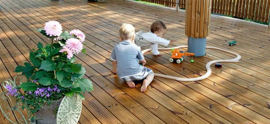 Декинговое покрытие безопасно для детей. Оно приятно на ощупь, не нагревается и не обжигает, поэтому по площадке можно ползать, бегать босиком. На настиле нельзя поскользнуться, пораниться, поставить занозу.