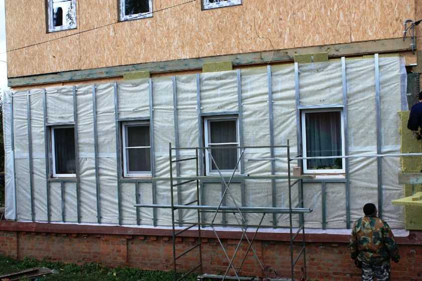 Утеплитель укладывается между направляющих каркаса, который набивается под рассматриваемый отделочный материал для фасада частного дома. Далее поверх него настилается еще один слой гидроизоляции. Причем все делается так, чтобы между мембраной и теплоизолятором на стенах дома оставалась воздушная подушка.