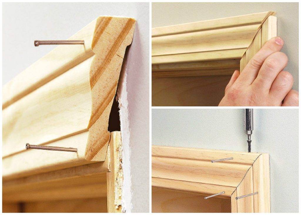 Купив необходимый материал, следует произвести замеры и обрезать изделия, исходя из них. Особенность установки заключается в том, что края спиливаются под углом в 45 градусов. Наличник примеряется к месту установки и прикрепляется при помощи шпилек и гвоздей.