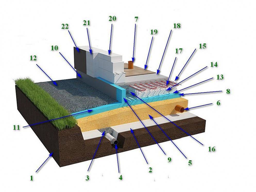 - Материалы: песок, гравий, геотекстиль, трубы для дренажа, бетон, экструдированный пенополистирол, доски для поддержки опалубки, система теплого пола.