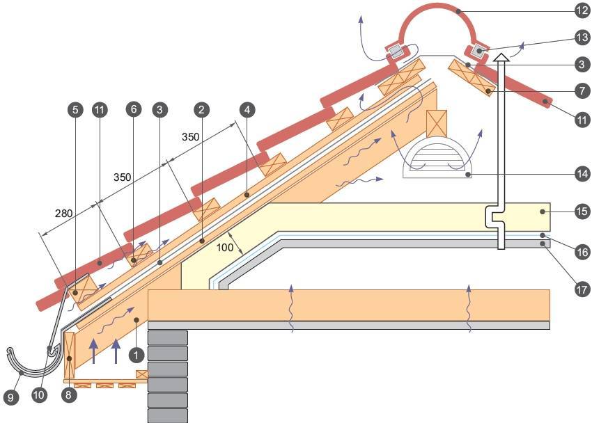 Схема монтажа кровельного пирога: 1. Система стропил, 2. Контррейки, 3. Гидроизоляционная пленка, 4. Бруски вертикальной обрешетки, 5. Стартовый брус горизонтальной обрешетки, 6. Бруски горизонтальной обрешетки, 7. Обрешетка дополнительная, 8. Ветровая доска, 9. Кронштейн для желоба, 10. Карнизная планка, 11. Металлочерепица, 12. Кровельный конек. 13. Коньковый уплотнитель, 14. Слуховое окно, 15. Материал теплоизоляции, 16. Пароизоляционный материал, 17. Подшивка мансарды.