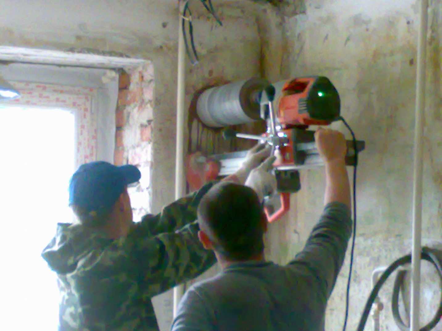 в стене сверлим отверстие диаметром не больше 7 сантиметров. При этом следует открыть окно, что позволит нам избавиться от образующейся пыли.