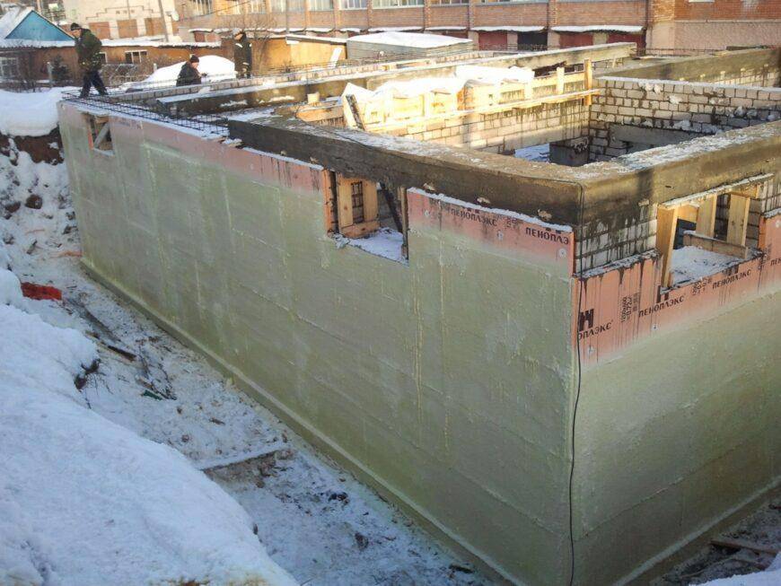 Для утепления подземной части ленточного фундамента необходимо обеспечить свободный доступ к поверхности строительной конструкции. Для строящегося здания это сделать проще. Изоляция монтируется сразу после снятия опалубки до выполнения обратной засыпки.