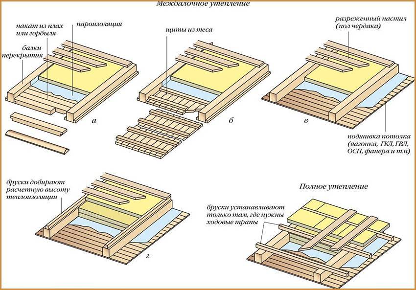 Здесь больше внимания нужно уделить нижнему основанию, в противном случае утеплитель может высыпаться сквозь прорехи. Для этого используются либо доски, либо специальное застилочное покрытие (рубероид, пергамин или пароизоляция).