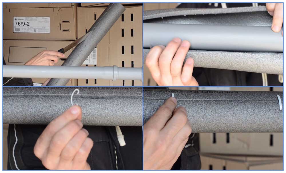 Решая, как утеплить трубы отопления на улице своими руками, следует в первую очередь рассматривать ПЭ оболочки подходящего внутреннего диаметра с закрытыми ячейками. Они имеют поверхностную пленку различных цветов, чтобы закрыть продольный шов, используют скотч, скобы, самоклеющиеся разновидности трубок или любой клей для полиэтилена. ПЭ трубки в зависимости от удобства использования приобретают стандартной длины 2 или 10 м, работы по монтажу проводят в следующей последовательности: