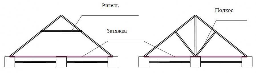 - Ригель и затяжка – горизонтальные брусья, скрепляющие стропильные пары в верхней и нижней части, соответственно.