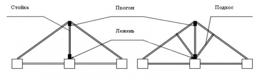 - стойки и подкосы используются для сооружения конструкции с многопролётностью, в этом случае необходимо ещё установить несколько опор на накосную ногу;