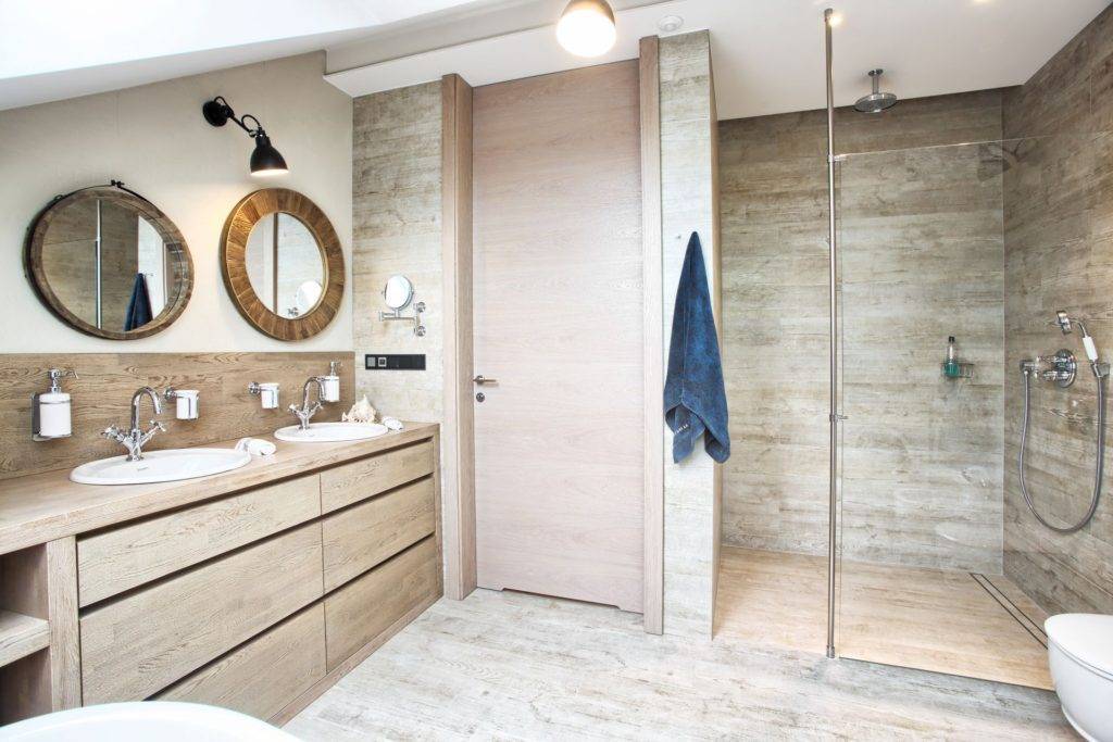 Благодаря современных технологиям обработки, дерево и камень всё чаще используются в отделке ванных комнат
